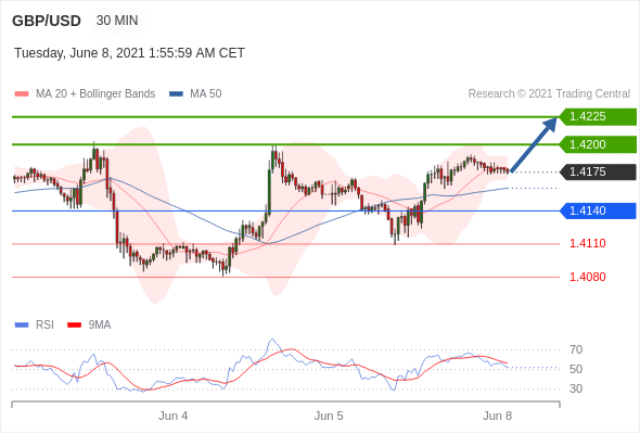英镑/美元 当日内: 朝1.4225运行。