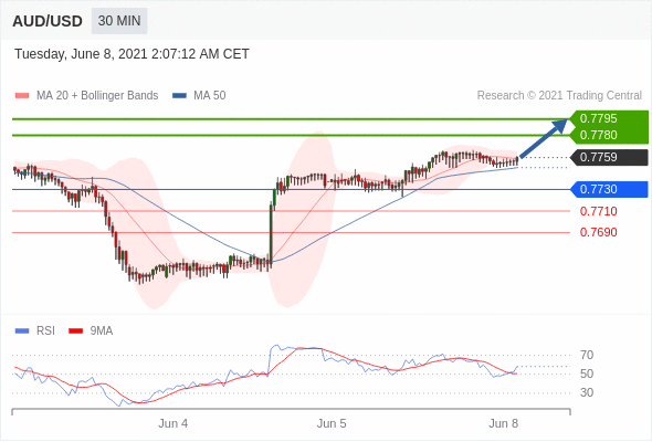 交易策略: 在 0.7730 之上,看涨,目标价位为 0.7780 ,然后为 0.7795 。