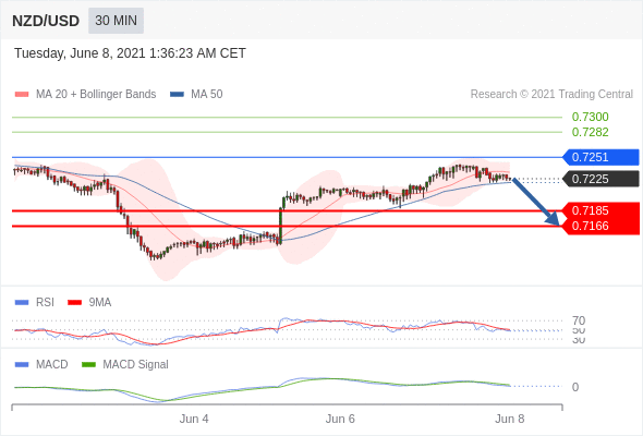 新西兰元/美元 当日内: 逐渐下跌,当 0.7251 阻碍上行,则 0.7166 为目标位。