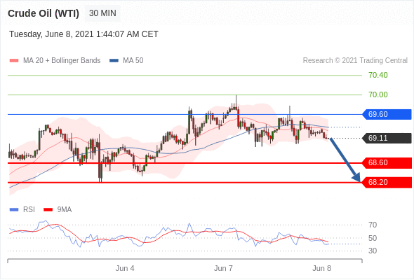 交易策略: 在 69.60 之下,看跌,目标价位为 68.60 ,然后为 68.20 。