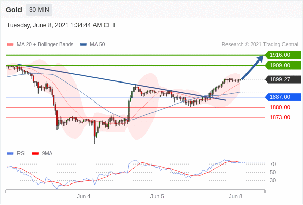 交易策略: 在 1887.00 之上,看涨,目标价位为 1909.00 ,然后为 1916.00 。
