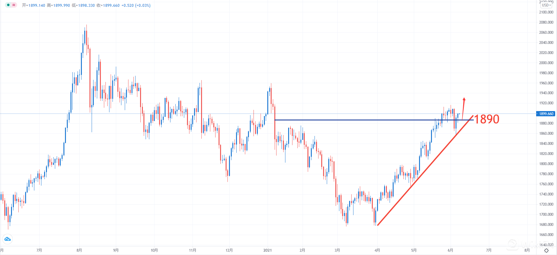 周一金价大幅回升,现货黄金尾盘一度较日低上扬近19美元,至1900.17美元/盎司;美元指数下跌,这增强了黄金对持有其他货币的投资者的吸引力。金价迈向1900美元大关前正稍作喘息,环境利好进一步看涨。