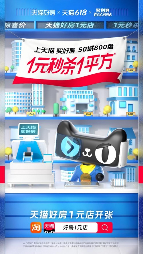 日前,上海、武汉、杭州、重庆等多个热门城市在内的50城800盘,上天猫只要1元就能秒杀这些楼盘的1个平方。天猫好房联合“聚划算百亿补贴”,史上最牛“1元店”全面上线。
