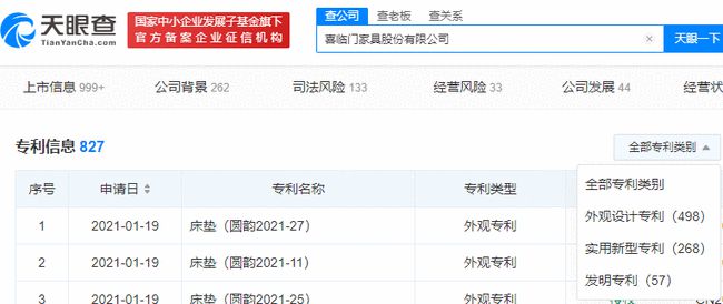 相比之下,喜临门在专利数量上拥有着绝对优势。据天眼查App数据显示,截至今年5月底,喜临门共持有专利总数823项,其中外观设计专利498项,实用新型专利268项,发明专利57项。而在媒体公开报道中,喜临门董事长陈阿裕作为首席技术专家,早在1993年就申报了喜临门的第一个专利,他个人总共申请国内专利281项,国际专利10项。