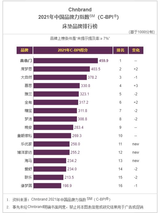 正是如此,凭借较高的品牌认知度、品牌忠诚度和品牌美誉度,喜临门连续6年、总共9次问鼎工信部认证的“中国品牌力指数”第一品牌。相比之下,慕思曾入围过7次“中国品牌力指数”,最好成绩为今年的第4名,而梦百合则没有入围。
