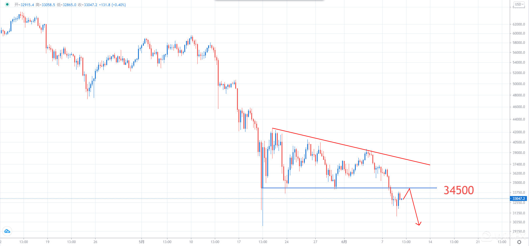 北京时间6月8日,比特币日内连破4道整数关口,一度暴跌近10%,暂报32605美元。较上个月65000美元的历史高点几近腰斩,多头防御阵线一触即溃。