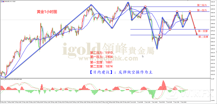 如黄金1H图所示,黄金自上周四低点1855开始震荡上行,昨天反弹至1904附近的新高后,MACD红色动能柱并未同步新高出现MACD顶背离信号。随后昨天晚间再度快速反弹,但没有突破1904高点压力,表明上方高点压力有效。K线上看,自昨晚高点下行之后,目前反弹力度远小于上涨力度,也表明上涨动能弱于下跌动能,建议投资者可以考虑在第一压力做空。