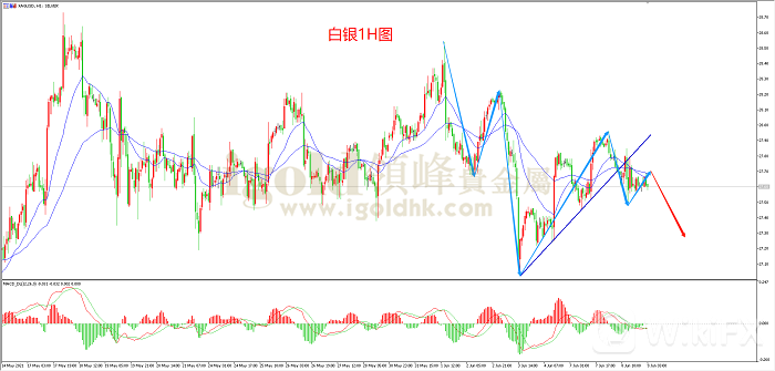 白银1H图来看,白银结束了自高点28.5到低点27附近的下跌,开始了震荡上行,白银此前始终处于上升趋势线之上,而昨天正式跌破趋势线支撑,开始展开下跌。从均线指标来看,白银MA20和MA60已经开始拐头向下,同时目前K线一直在均线下方,表明当前上涨动能较弱,建议投资者日内可考虑逢高做空的思路操作。