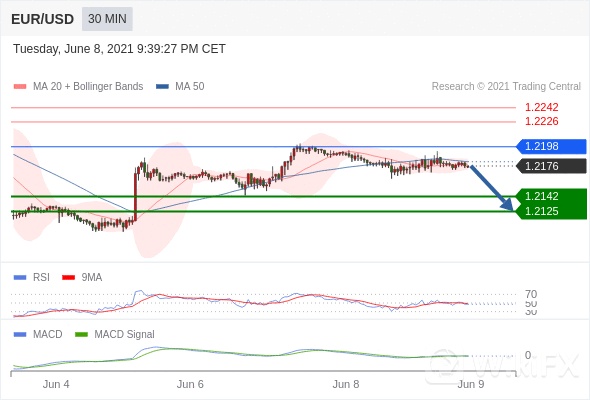 欧元/美元 当日内: 看跌,在 1.2198 之下。 转折点定在:1.2198 交易策略:看跌,在 1.2198 之下。备选策略:向上突破 1.2198 ,将带来继续上行的趋势,目标位定在 1.2226 和 1.2242 。 技术点评 :RSI技术指标低于50。 MACD技术指标处在其信号线之下 看空。 此外,价位低于其20天及50天移动平均线 ( 分别位于 1.2178 和 1.2181 )。