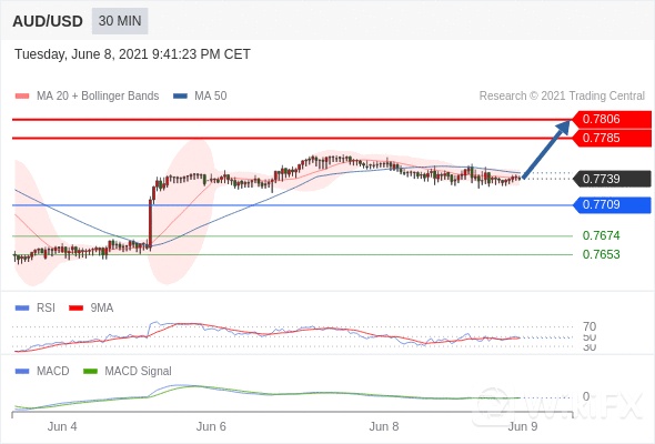 澳元/美元 当日内: 有上涨的可能,目标价位定在 0.7806 。 转折点为:0.7709 交易策略:有上涨的可能,目标价位定在 0.7806 。备选策略:如跌破 0.7709 ,AUD/USD 目标方向定在 0.7674 和 0.7653 。 技术点评 :RSI技术指标低于50。 MACD技术指标呈现看跌状态并 处在其信号线的上方。 此外,价位处在其20天及50天移动平均线下方 ( 当前是 0.7740 和 0.7746 )。