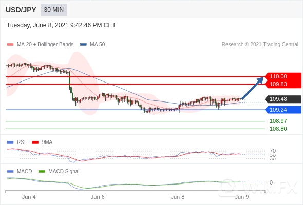 美元/日元 当日内: 看涨,当 109.24 为支撑位。 109.24 作为转折点。 交易策略:看涨,当 109.24 为支撑位。备选策略:向下跌破 109.24 ,将带来继续下跌的趋势,目标位为 108.97 然后为 108.80 。 技术点评 :RSI技术指标超过50。 MACD技术指标呈现看多状态并 处在其信号线的上方。 此外,价位处在其20天及50天移动平均线上方 ( 当前是 109.45 和 109.41 )。