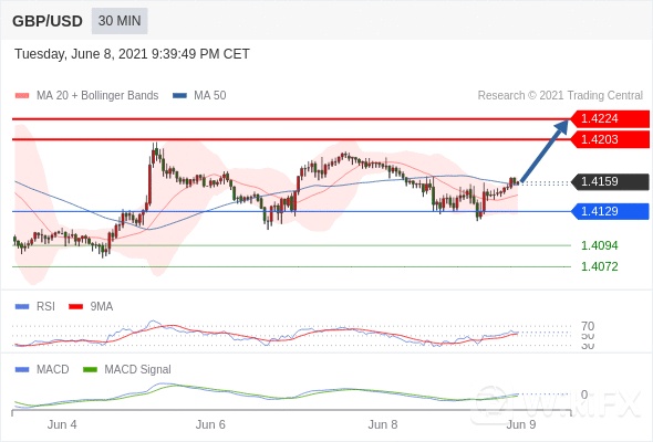 英镑/美元 当日内: 看涨,当 1.4129 为支撑位。 1.4129 作为转折点。 交易策略:看涨,当 1.4129 为支撑位。备选策略:如跌破 1.4129 ,GBP/USD 目标方向定在 1.4094 和 1.4072 。 技术点评 :RSI技术指标大于中性区域50。 MACD技术指标处在其信号线之上 看多。 此外,价位处在其20天及50天移动平均线上方 ( 当前是 1.4146 和 1.4156 )。