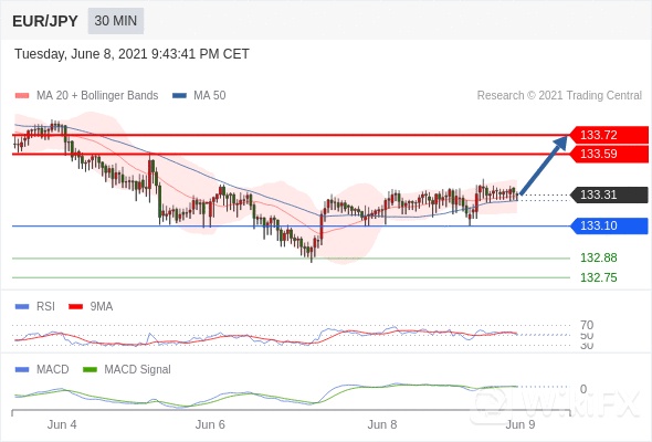欧元/日元 当日内: 看涨,当 133.10 为支撑位,目标定在133.72。 133.10 作为转折点。 交易策略:看涨,当 133.10 为支撑位,目标定在133.72。备选策略:如跌破 133.10 ,EUR/JPY 目标方向定在 132.88 和 132.75 。 技术点评 :RSI技术指标超过50。 MACD技术指标处在其信号线之下 看多。 此外,价位处在其20天及50天移动平均线上方 ( 当前是 133.30 和 133.27 )。