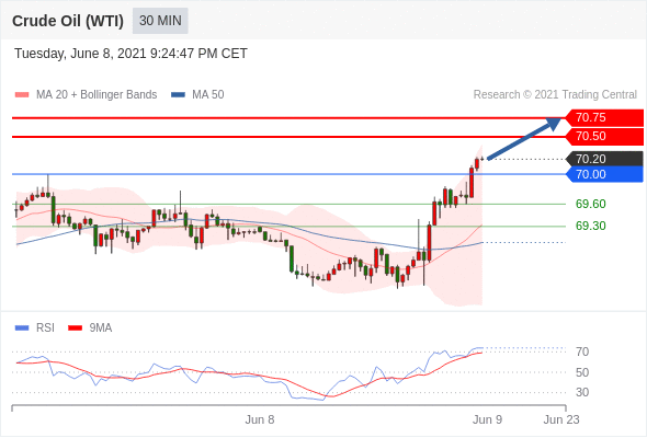 原油 (WTI)(N1)当日内: 进一步上涨。转折点:70.00 交易策略:在 70.00 之上,看涨,目标价位为 70.50 ,然后为 70.75 。 备选策略:在 70.00 下,看空,目标价位定在 69.60 ,然后为 69.30。 技术点评:RSI技术指标向上运行。