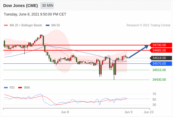 美国道琼斯30指数 (M1)当日内: 超短线(当日内)支撑位在34570.00附近。转折点:34570.00 交易策略:在 34570.00 之上,看涨,目标价位为 34685.00 ,然后为 34730.00 。 备选策略:在 34570.00 下,看空,目标价位定在 34515.00 ,然后为 34430.00。 技术点评:RSI技术指标在50%中性区域之上。
