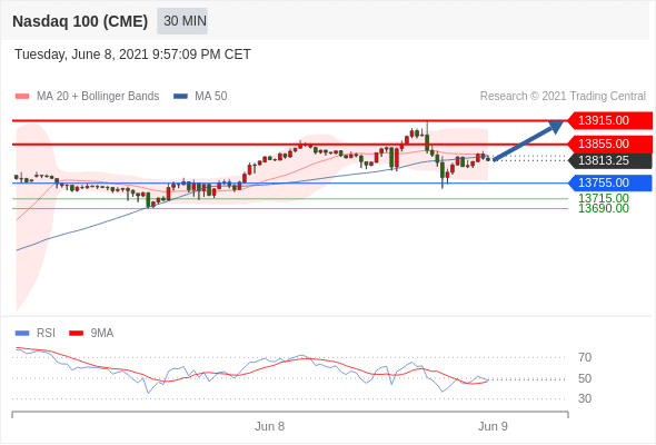 美国纳斯达克100指数期货 (M1)当日内: 反转向上。转折点:13755.00 交易策略:在 13755.00 之上,看涨,目标价位为 13855.00 ,然后为 13915.00 。 备选策略:在 13755.00 下,看空,目标价位定在 13715.00 ,然后为 13690.00。 技术点评:RSI技术指标在50%中性区域下方,并向上反转。