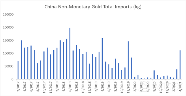 不断上涨的价格压力可能会继续支撑黄金,人们普遍认为黄金是一种保值和对冲通胀的手段。在需求方面,自4月份中国人民银行(PBoC)放松对非货币性黄金进口的限制以满足不断增长的国内需求以来,中国买家已重返黄金市场。从那以后,中国的黄金进口量显著增加(见下表)。作为全球第三大黄金进口国,中国买家可能为金价提供中期支撑。