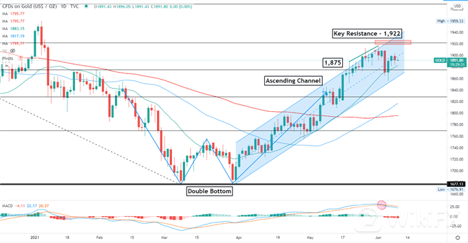 从技术上讲,金价在心理阻力位1,900美元上方面临卖压。价格仍处于自4月初以来形成的“上升通道”,表明总体趋势仍偏向看涨。突破1,900美元可能为进一步的上行潜力打开大门,关注1,922美元(61.8%的斐波那契回档位)。MACD指标形成了看跌交叉,预示着技术回调可能正在进行。