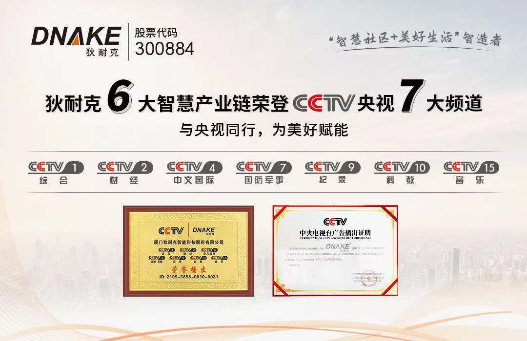 2021年5月24日-6月13日,狄耐克智慧社区整体解决方案将重磅登陆中央电视台频道,与广大消费者见面!狄耐克楼宇对讲、智能家居、智慧医疗、智慧通行、新风系统、智能门锁等产业齐齐亮相,向全国14亿观众以及海外观众传递狄耐克的品牌故事。新起点,新高度,新形象,新战略,相信品牌的力量,也相信央视将助推狄耐克创造又一品牌奇迹!
