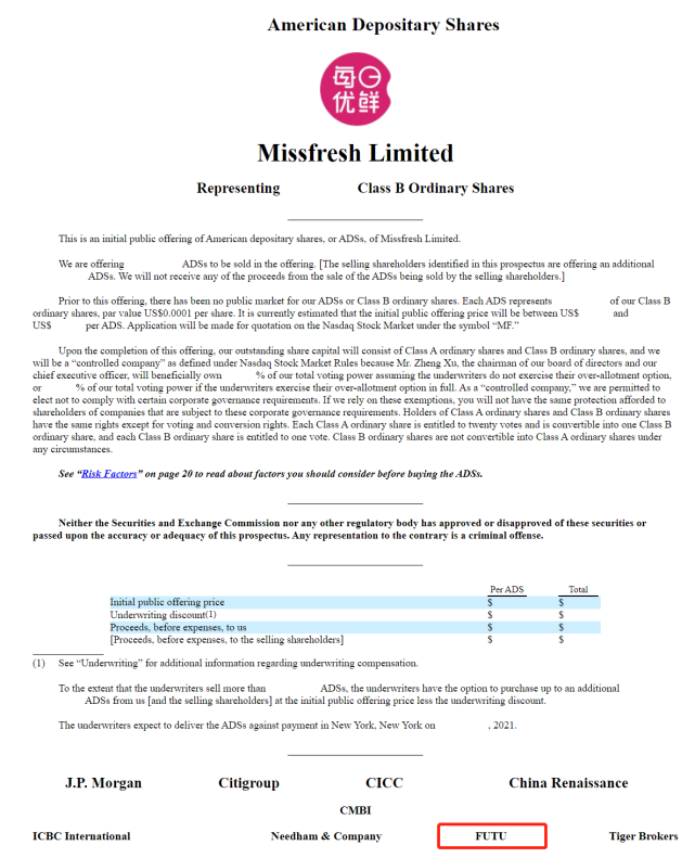 美国东部时间6月8日,每日优鲜正式向美国SEC递交招股说明书,计划以「 MF 」为股票代码在纳斯达克上市,此次IPO由摩根大通、花旗、中金、华兴等担任联席主承销商,富途也以联席簿记管理人(Co-Manager)的身份参与其中,助力每日优鲜顺利招股。