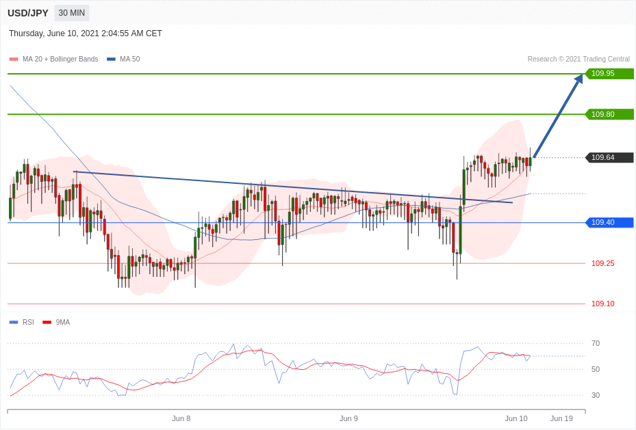 交易策略:在 109.40 之上,看涨,目标价位为 109.80 ,然后为 109.95 。