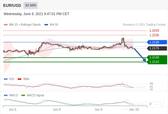 欧元/美元 当日内: 看跌,在 1.2199 之下。 转折点为:1.2199 交易策略:看跌,在 1.2199 之下。备选策略:如突破 1.2199 ,EUR/USD 目标方向为 1.2226 和 1.2243 。 技术点评 :RSI技术指标小于中性区域50。 MACD技术指标呈现看跌状态并 处在其信号线的下方。 此外,价位处在其20天及50天移动平均线下方 ( 当前是 1.2188 和 1.2182 )。
