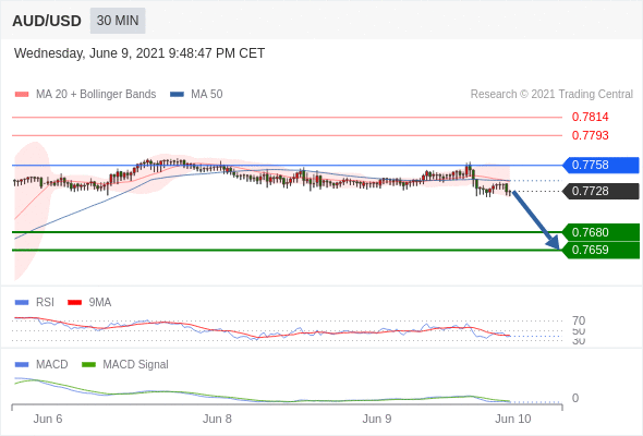 澳元/美元 当日内: 看跌,在 0.7758 之下。 转折点为:0.7758 交易策略:看跌,在 0.7758 之下。备选策略:向上突破 0.7758 ,将带来继续上行的趋势,目标位定在 0.7793 和 0.7814 。 技术点评 :RSI技术指标低于50。 MACD技术指标呈现看跌状态并 处在其信号线的下方。 此外,价位低于其20天及50天移动平均线 ( 分别位于 0.7739 和 0.7740 )。