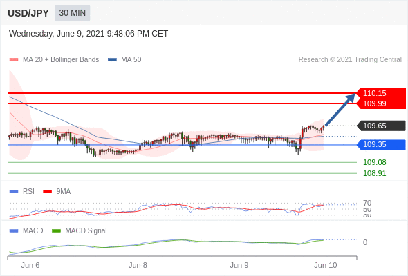 美元/日元 当日内: 看涨,当 109.35 为支撑位。 109.35 作为转折点。 交易策略:看涨,当 109.35 为支撑位。备选策略:如跌破 109.35 ,USD/JPY 目标方向定在 109.08 和 108.91 。 技术点评 :RSI技术指标超过50。 MACD技术指标处在其信号线之上 看多。 此外,价位高于其20天及50天移动平均线 ( 分别位于 109.51 和 109.48 )。