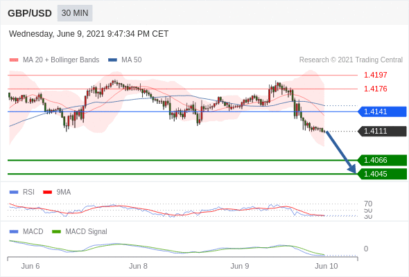 英镑/美元 当日内: 看跌,在 1.4141 之下。 1.4141 作为转折点。 交易策略:看跌,在 1.4141 之下。备选策略:向上突破 1.4141 ,将带来继续上行的趋势,目标位定在 1.4176 和 1.4197 。 技术点评 :RSI技术指标小于中性区域50。 MACD技术指标呈现看跌状态并 处在其信号线的下方。 此外,价位处在其20天及50天移动平均线下方 ( 当前是 1.4135 和 1.4150 )。