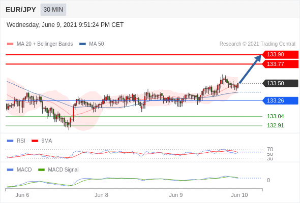 欧元/日元 当日内: 看涨,当 133.26 为支撑位,目标定在133.90。 133.26 作为转折点。 交易策略:看涨,当 133.26 为支撑位,目标定在133.90。备选策略:向下跌破 133.26 ,将带来继续下跌的趋势,目标位为 133.04 然后为 132.91 。 技术点评 :RSI技术指标大于中性区域50。 MACD技术指标呈现看多状态并 处在其信号线的下方。 此外,价位处在其20天及50天移动平均线上方 ( 当前是 133.47 和 133.38 )。
