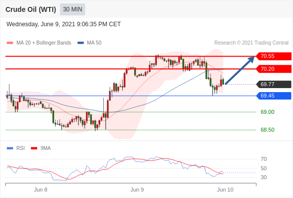 原油 (WTI)(N1)当日内: 超短线(当日内)支撑位在69.45附近。转折点:69.45 交易策略:在 69.45 之上,看涨,目标价位为 70.20 ,然后为 70.55 。 备选策略:在 69.45 下,看空,目标价位定在 69.00 ,然后为 68.50。 技术点评:RSI技术指标在50%中性区域下方,并向上反转。