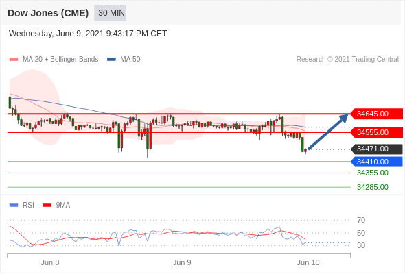 美国道琼斯30指数 (M1)当日内: 期待上涨。 转折点:34410.00 交易策略:在 34410.00 之上,看涨,目标价位为 34555.00 ,然后为 34645.00 。 备选策略:在 34410.00 下,看空,目标价位定在 34355.00 ,然后为 34285.00。 技术点评:RSI技术指标刚达到30%重要支撑区域附近,并向上反转。