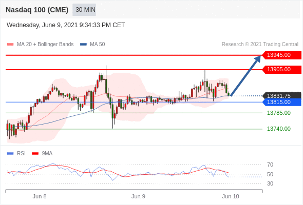 美国纳斯达克100指数期货 (M1)当日内: 试探其通道支持线。转折点:13815.00 交易策略:在 13815.00 之上,看涨,目标价位为 13905.00 ,然后为 13945.00 。 备选策略:在 13815.00 下,看空,目标价位定在 13785.00 ,然后为 13740.00。 技术点评:超短线(当日内)技术指标运行趋势复杂。