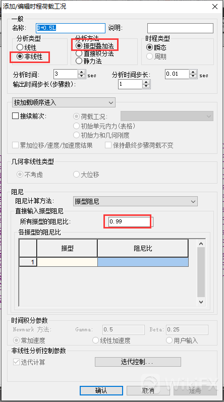 分析方法必须选择非线性振型叠加,否则无法作为后续隔震分析的初始状态,阻尼比取0.99是尽量让结构自重加上去不引起动力放大作用,忽略动力部分。