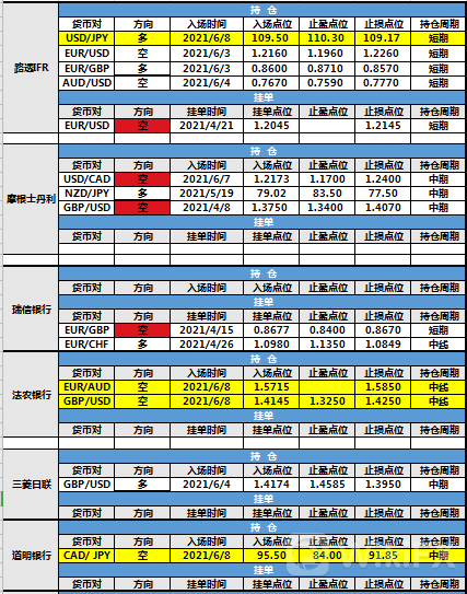 持仓方面,三投行仓位调整,其中路透IFR美元兑日元止损点位调整至109.17,目前处于持仓中;法农银行欧元兑澳元入场点位调整至1.5715,止损点位调整至1.5850,目前处于持仓中,英镑兑美元入场点位调整至1.4145,止盈点位调整至1.3250,止损点位调整至1.4250,目前处于持仓中;道明银行加元兑日元入场点位调整至95.50,止盈点位调整至84.00,止损点位调整至91.85,目前持有持仓中。