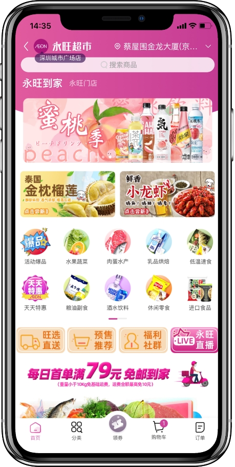 除香港区域外,大陆所有店铺通过永旺APP及小程序内下单、门店骑行5公里范围内极速配送到家,为会员提供有品质、有温度、有真情的全新服务。