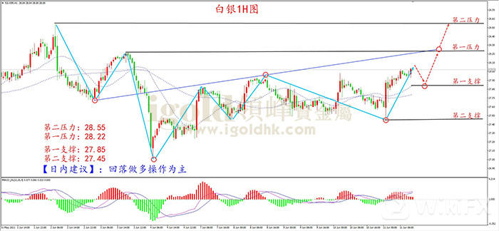 从上图白银1H周期走势来看,白银自27.45低位上涨,并刷新近期高点。从形态上看,白银自27.02的6月3日低点反弹以来,呈现震荡上行的形态,且价格处于MA20均线上方,表明价格处于多头走势,后市较大概率延续上涨。日内关注27.85附近的MA20均线支撑,上方关注28.22压力位;结合MACD指标来看,DIFF线与DEA线金叉向上,表明多头力量偏强,日内可在27.85附近尝试多单。