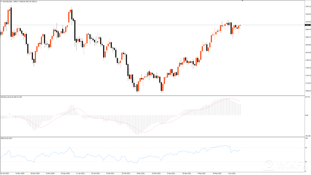 技术面:黄金昨日上涨,目前位于1900.00附近,美元指数出现下跌,美国CPI数据上升高位,黄金因此快速上涨,上探1900美元关口。黄金价格目前情况看需要关注美国相关数据情况,未来美元走势也对黄金价格影响较强。