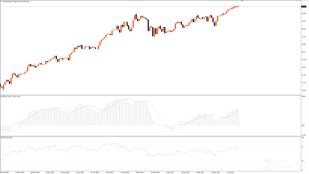技术面:原油价格昨日高位震荡,目前位于69.80美元附近,原油价格高位略有上涨,冲击上方70美元关口。市场需求仍然维持高位,美元指数下跌对于原油价格有所影响,更多需要关注OPEC相关决议。