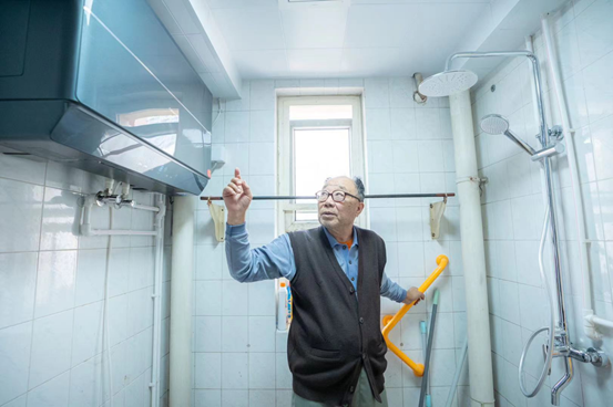 6月4日,家住青岛市南区的空巢老人王爷爷,家里的浴室也摇身一变。洗澡前仅需一句话就能提前预约热水。洗澡时不仅可以随时一句话调整水温,而且还能变洗边听戏剧。洗完后地面还会烘干,防止湿滑导致老人摔倒。