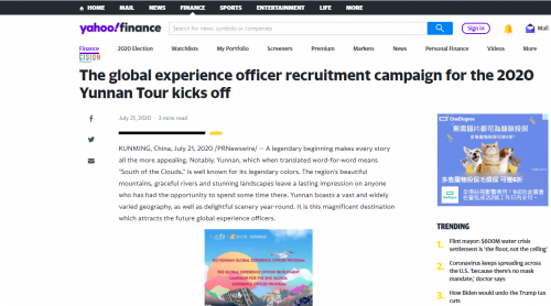 2020年7月20日,腾云“一机游”海外推广正式启动,作为一部手机游云南的初次海外正式发声,本次以宣传云南旅游文化和推广一部手机游云南英文版APP为核心推广目标,通过互联网广泛布局,建立市场初印象、为后续深入海外市场建立良好基础。以一套涵盖网络社交媒体、全球新闻报道、社交平台广告、全球网络红人发声的多维度矩阵式线上推广策略,传播媒体和渠道包括ABC、NBC、FOX、YAHOO、Facebook、Google、YouTube、Twitter等等海外头部媒体和平台,历时70天,收获了5859万+的曝光,1万+的APP下载量。