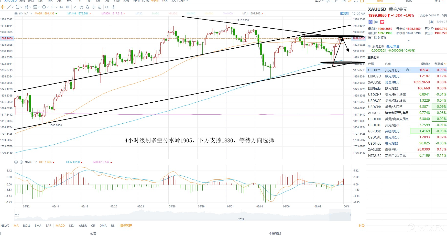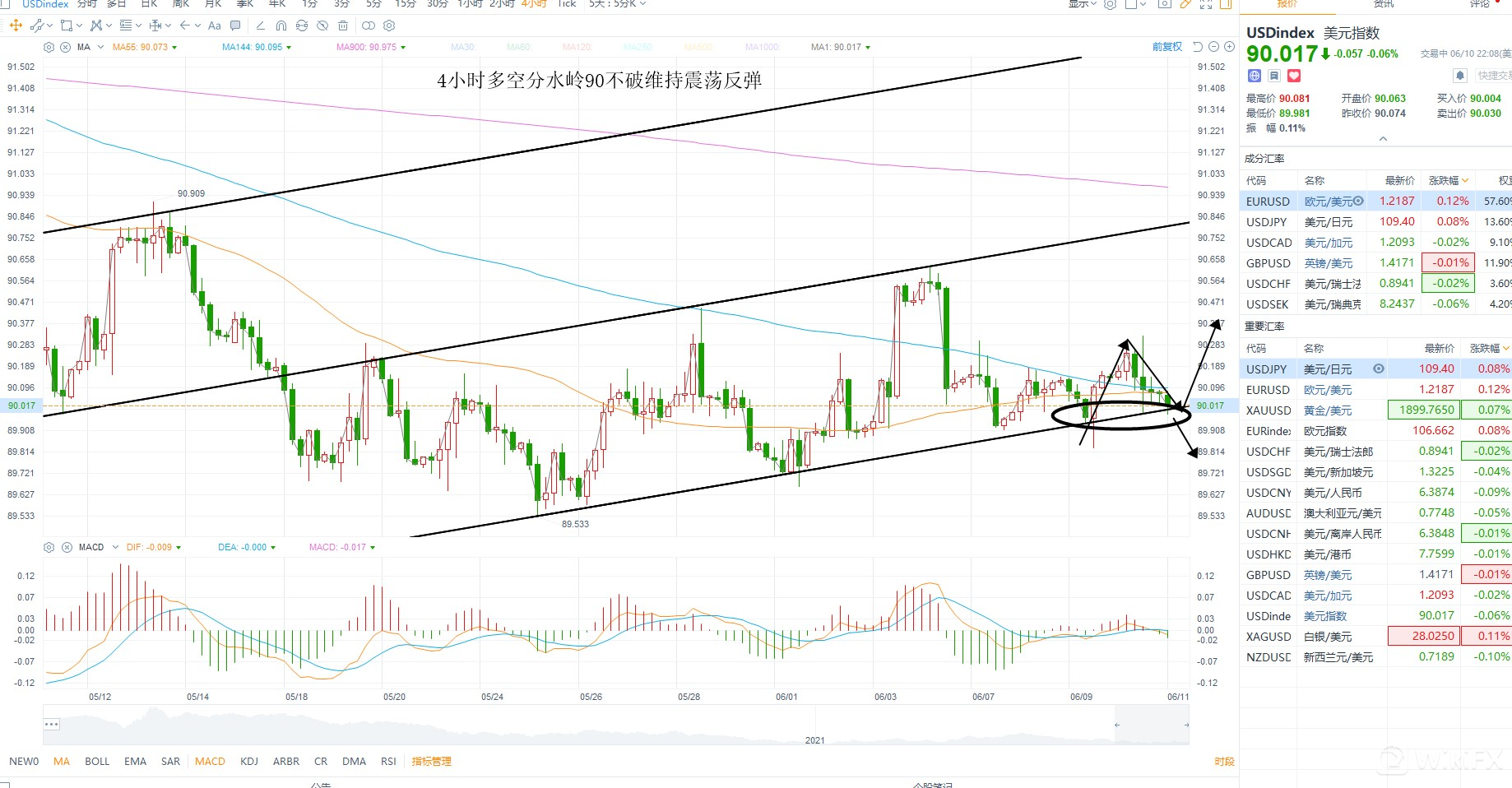 昨日美国通胀数据超预期,但市场认为美联储会无动于衷,也就是对于加息预期不再那么强烈,因此反馈上来看,施压美元,同时美债收益率下行,提振金价走高,而美股继续上涨,由于美债收益率的走弱,纳斯达克指数走强,估值修复再次提上日程,从目前情况来看美元依然没有走出方向,大概率要等待美联储利率决议才会给出方向,但是市场短期太过乐观,谨防超预期的事件发生,技术层面上美元指数支撑90不破维持震荡反弹为主,上方压力90.5