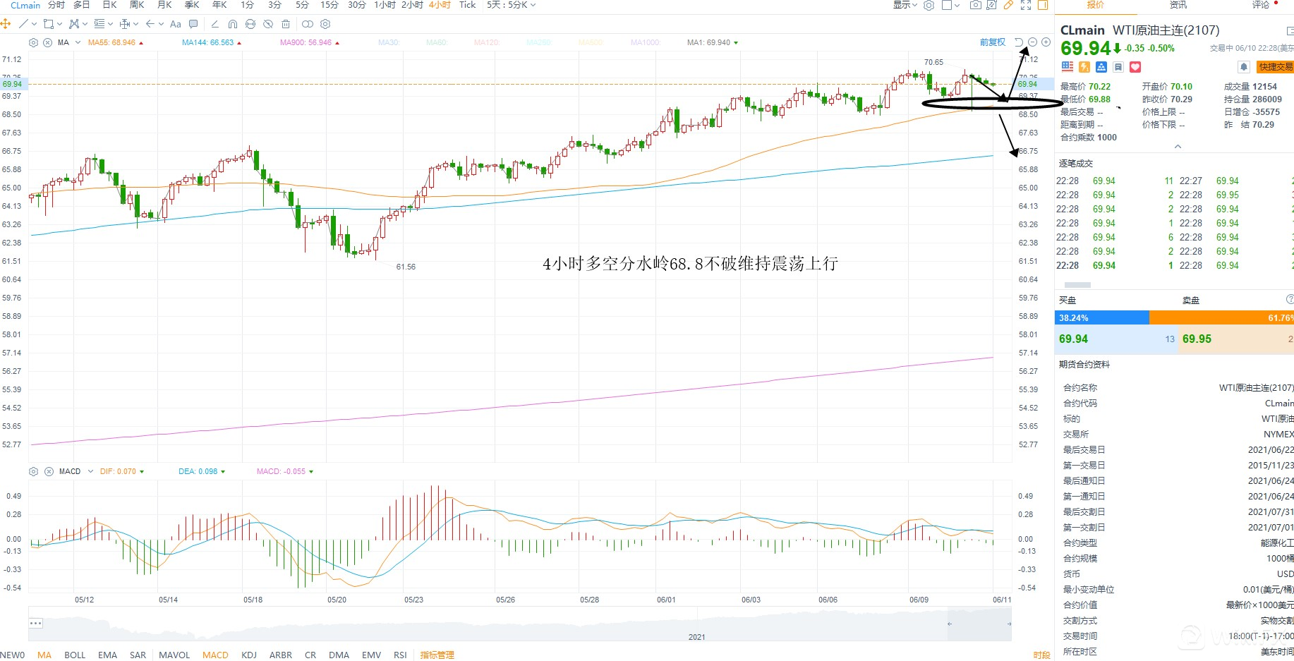 美原油继续高位震荡,基本面上供需失衡导致本轮价格上涨,这个看大宗商品就可以了,而目前进入需求旺季,所以短期的反馈上油价只要不破上升趋势线,则依然维持多头向上为主,从技术层面上来看,多空分水岭68.5不破维持多头结构不变,上方密集成交区间72美元附近存在较大压力,短期高位震荡偏上行,等待加速之后的调整机会