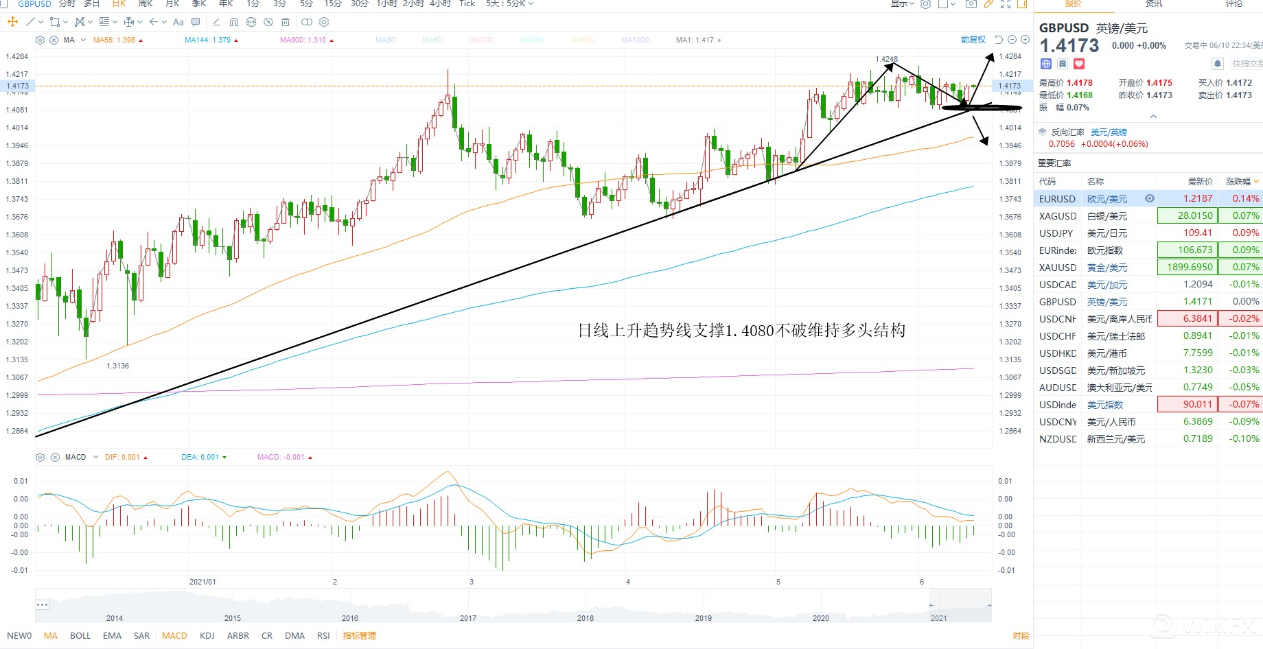 镑美短期走势比较独立,而且在基本面上好于欧元,因此就算美元反弹,对于镑美的影响不会很大,反而震荡之后有望重新走强,技术层面上来看,目前依然是日线收敛的过程,短期重要支撑1.4080不能跌破,否则有深度调整的风险,上方压力1.4200突破则有望打开上升空间,注意,没有明确突破之前,等待回踩支撑为主