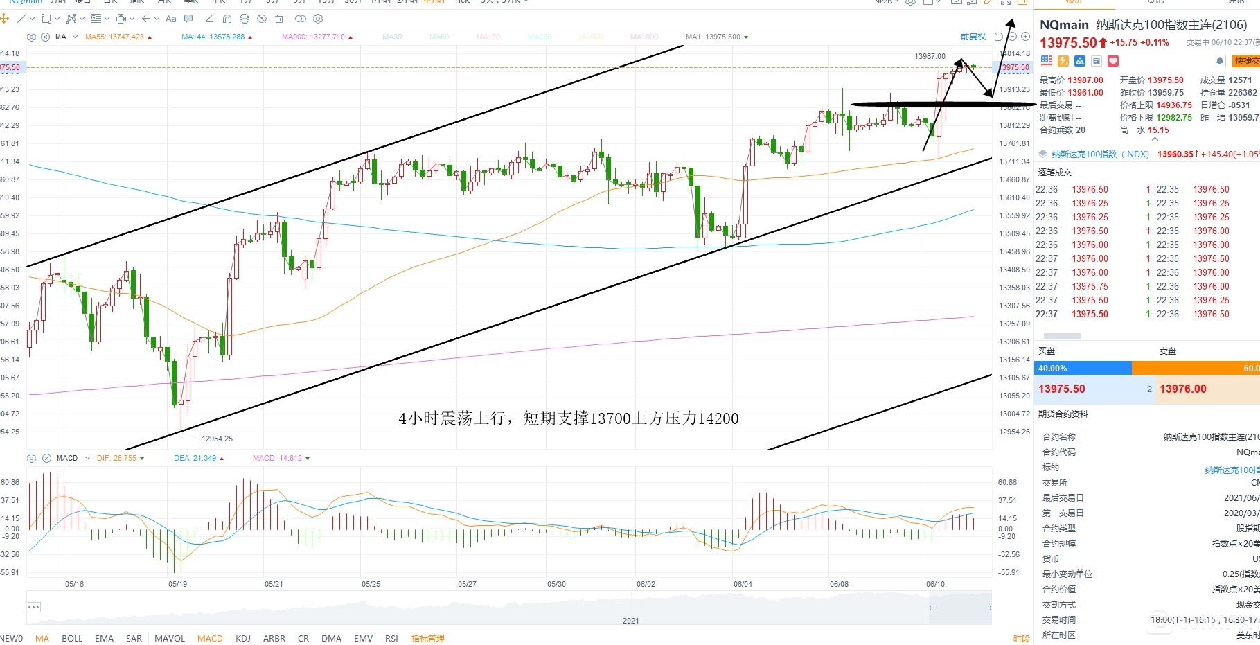 纳斯达克指数昨日大幅上涨测试箱体上沿压力,基本面上主要是反馈了美债收益率下行的动作,要注意的是目前基本面上只是预期,真正的考验在下周的FED利率决议,如果继续保持宽松则股指继续上行,否则有冲高回落的风险,短期重要压力14200附近不破则维持箱体震荡为主,下方重要支撑13700