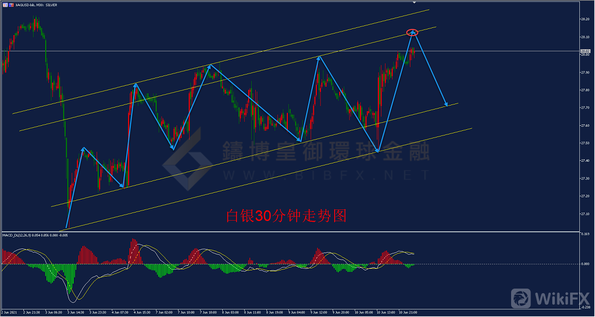昨日亚欧时段,白银小幅回落27.52附近,美盘受到数据影响下探27.45附近支撑后,价格快速强势上涨,最高涨至28.02附近。从30分周期走势结构看,白银自底部涨至27.83附近后,在节奏上维持宽幅震荡上行,形成上升通道,当前价格依旧处于通道内部,通道运行良好,价格有接近通道上轨的迹象。结合MACD指标来看,DIFF线与DEA线处于零轴上方运行,双线出现死叉往下,说明价格短线有回调的需求,日内可等待涨至28.13附近尝试空单。