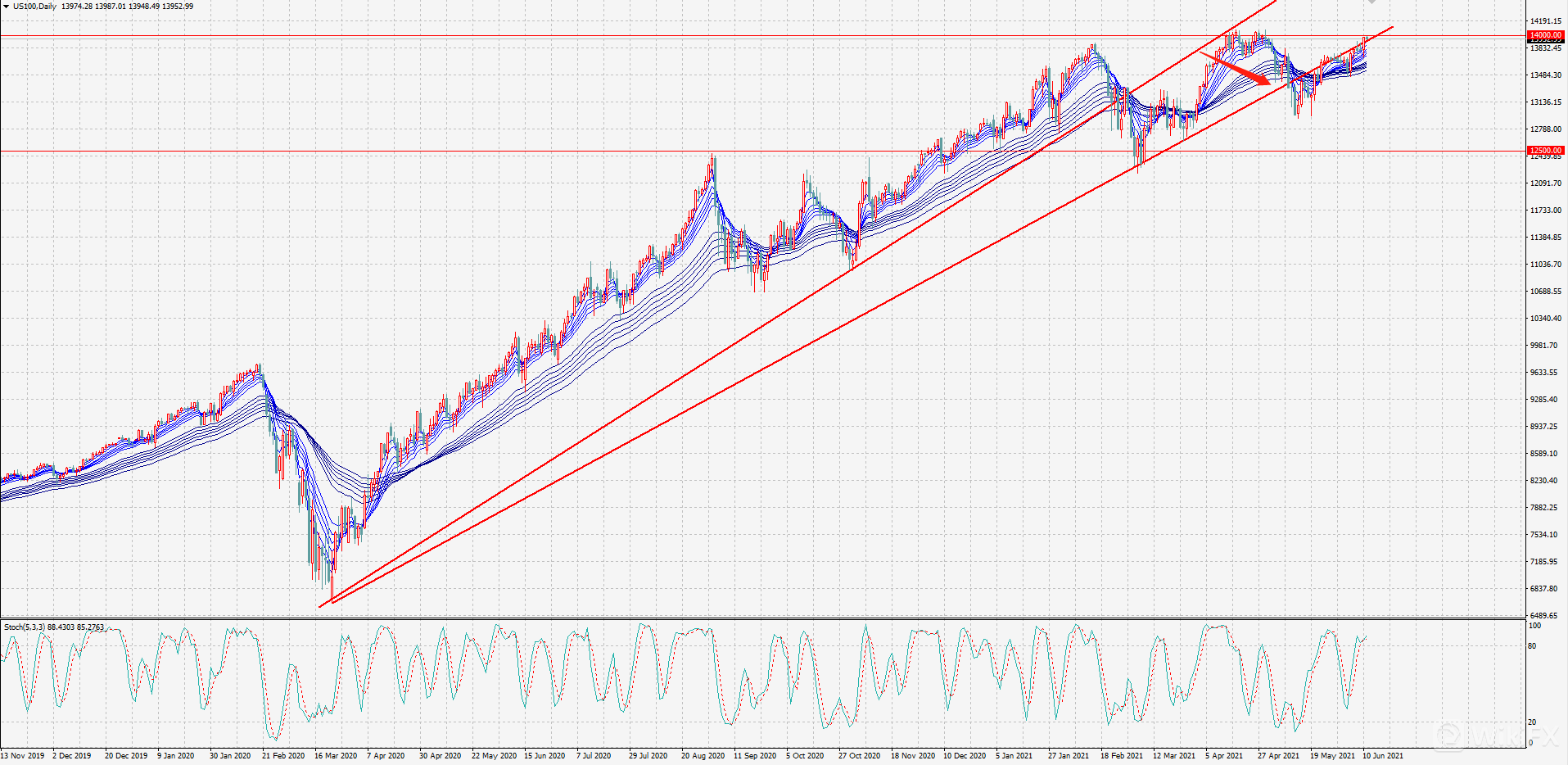 日线图,纳指二月份跌破上涨趋势线,回踩12500后继续上行。四月中旬首次触及历史新高14000,高位窄幅震荡数日。总体上,纳指涨速有所减缓,但中长期上涨趋势不改,短期有效突破14000是大概率事件。