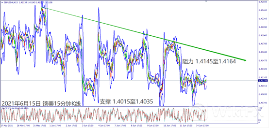 日级别线图,三天冲不过5日均线,一旦跌破1.4100关口,可能形成箱型反转;15分钟K线,近期下跌形成层层阻力,若跌破盘整底部,可能回测盘整支撑。