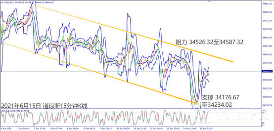 日级别线图,出现圆形顶反转,若5日均线反压冲不过,可能下探波段新低;15分钟K线,上周跌势出现下降趋势线,若冲不过线型阻力,可能回测5月起涨支撑。
