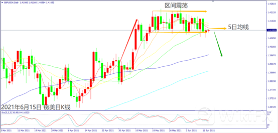 日级别线图,近期在5日均线下方震荡,若跌破1.4100关口,可能出现箱型反转走跌。